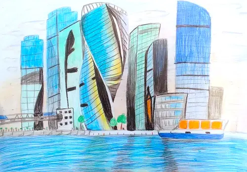 Меня зовут Арина. На своём рисунке я изобразила Москва-сити. Это не просто бизнес-центр, а настоящий город будущего посреди столицы. Это место для меня - символ амбиций: здесь мечты становятся проектами, а высота зданий вдохновляет покорять вершины.