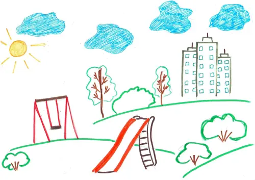 Часто после школы я гуляю на игровой площадке рядом с домом. Мне там очень нравится и я решила нарисовать эту площадку. Там всегда весело и интересно, мы с друзьями часто там играем.