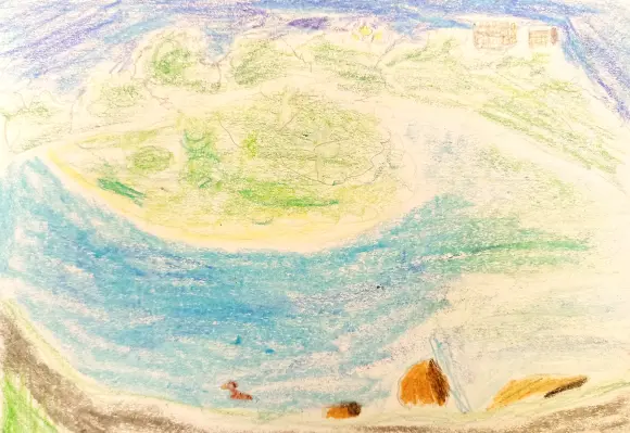 Этот детский рисунок изображает живописный природный пейзаж с озером или рекой, окружённой зеленью и холмами. В центре находится водная гладь, окрашенная в голубой цвет, что создаёт ощущение спокойствия и свежести. Вокруг воды расположены зелёные земли, вероятно, луга или парки, с деревьями и кустами, что подчеркивает природную красоту и гармонию.