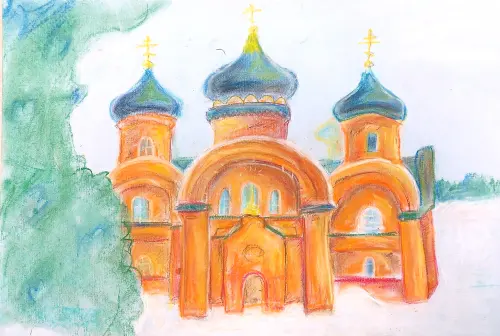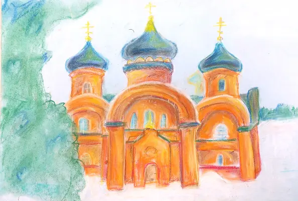Я учусь в художественной школе. Мы часто выходим на пленэр, где рисуем множество картин и набросков окружающей природы, архитектуры и памятников. Особенно мне запомнился этот храм. Он очень яркий, аккуратный и необычный.
