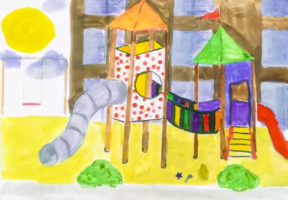 На улице Академика Волгина, дом 8А, в районе Обручева, есть замечательная детская площадка. Это место, где дети могут весело проводить время и играть. На площадке есть песочницы, горки, карусели, качели. Вокруг конструкции растут зеленые кусты, которые добавляют уют и красоту этому месту. На заднем плане виднеется мой дом, в котором я живу. В верхнем левом углу рисунка изображено солнце, которое освещает всю площадку и создает атмосферу радости и веселья. Взрослые позаботились о детях, и всё это нужно беречь. Мой район самый лучший!