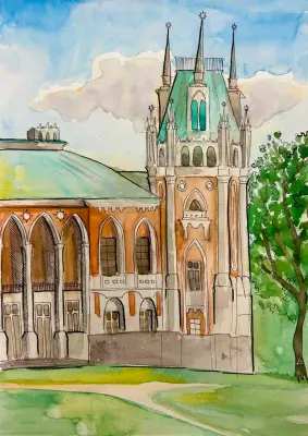 Добрый день! На своём рисунке я изобразила Государственный историко-архитектурный художественный и ландшафтный музей-заповедник «Царицыно». Мне безумно нравится это место, тут красиво, свежо и тихо. Особенно мне понравилось изображать резные колонны и зубцы на них, стремящиеся высоко-высоко, к самым небесам!