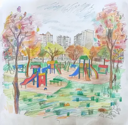 Это игровая площадка в моем любимом парке Михалково, в нем очень красиво. Парк окружен деревьями, за которыми видны здания. Осенью зеленая трава была покрыта опавшими листьями.