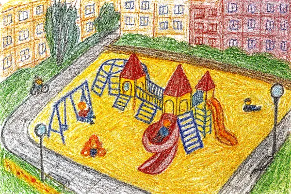 На рисунке изображена яркая детская площадка. Есть качели, горки и песочница. Дети играют и веселятся, радуются солнечному дню. Место наполнено улыбками и весельем!