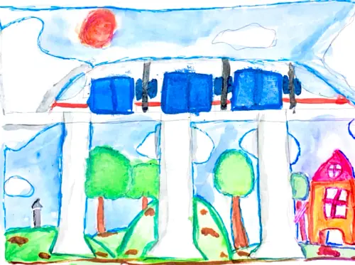 Смотрите, какую картинку я нарисовала! Тут наш район — большой-добрый, с высокими деревьями и красными цветами. У нас много площадок, где можно кататься на велосипеде и лазать по лесенкам. Ещё есть широкая дорожка, где гуляют мамы с малышами и дедушки играют в шахматы. Иногда вечером я сажусь на подоконник и смотрю в окно — так хорошо видно нашу улицу и разноцветные огонёчки фонарей. В общем, здесь у каждого ребёнка своя маленькая радость, а значит, и весь район становится счастливым!