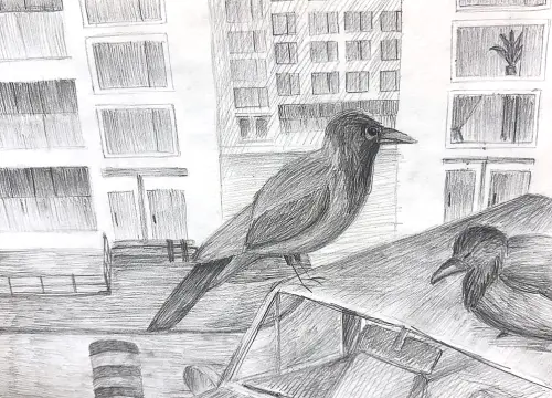 Рисунок А3, карандаш. На рисунке изображён двор с автомобилем, на котором гордо восседает ворона - местный житель. В работе с помощью графических средств показана линейная и воздушная перспективы.