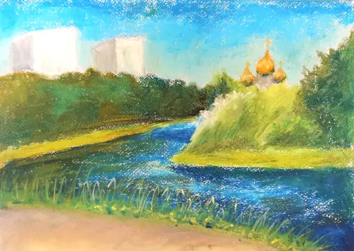 Этот детский рисунок изображает живописный пейзаж с рекой, зелёными деревьями и травой, а также с ярким голубым небом. Вдали на горизонте виднеются белые здания и золотые купола церкви, что придает сцене особую красоту и спокойствие.