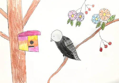 На рисунке, выполненном акварелью, изображена маленькая птичка, сидящая на ветке берёзы в парке «Бригантина». Берёза высокая и стройная, с белой корой и зелёными, только распустившимися листьями.