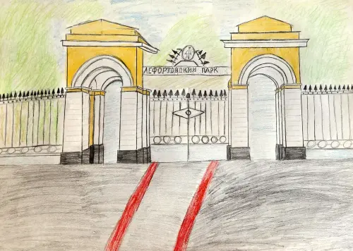 Это исторический парк в районе Лефортово. Мне нравится там прогуливаться с родителями. Очень красивые, торжественные центральные ворота входа. Их я и решил изобразить.