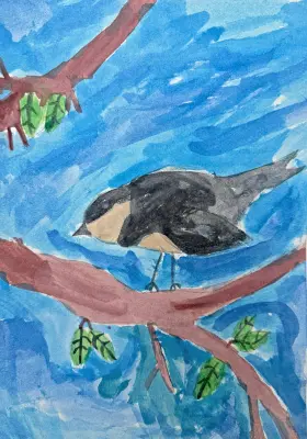 На рисунке, выполненном пастелью, изображена чёрная птица, готовящаяся к полёту. Ее крылья, широкие и мощные, находятся в нижней точке взмаха. Кажется, сейчас она вспорхнёт и покинет ветку.
