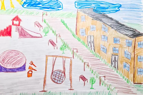 Я изобразил мой любимый двор, где я много провожу времени с друзьями и семьёй. Я катаюсь с горки или на качелях