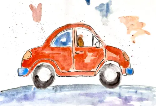 Во дворе, будто яркая конфетка среди серого асфальта, стоит машинка — огненно-красная, блестящая, как будто только что из салона. Она притягивает взгляд: то ли солнце играет на её капоте, то ли она сама излучает какой-то задорный свет. Мне она ужасно нравится! Не знаю, чья она.