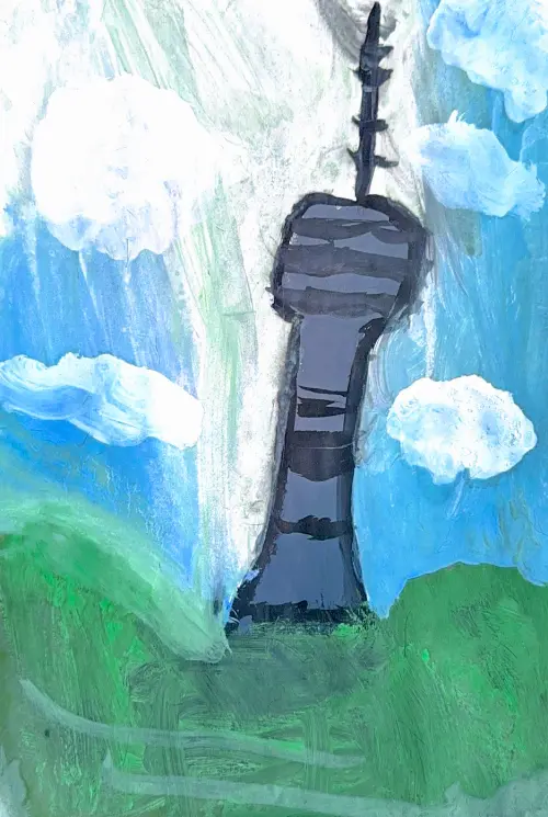 Мы с семьёй отправились гулять к Останкинской башне, попали под дождь, но мне было весело, я прыгал по лужам, и башня всё равно показалась красивой. Из-за тучки на нее светило солнце.