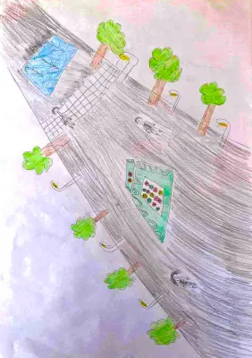 С высоты, будто на ладони, раскрывается Гончаровский парк – зелёный оазис, пронизанный извилистыми дорожками, будто тонкими нитями жизни. Сверху он кажется живым организмом: кроны деревьев сливаются в бархатное море, сквозь которое пробиваются солнечные блики, а аллеи расходятся лучами, словно нервная система этого огромного, дышащего пространства.