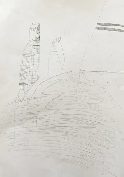 Погода в Москве часто пасмурна и туманна, часто идут дожди. Поэтому постоянно Москва — Сити в тумане. И каждое утро я наблюдаю такую картину, как на моем рисунке.