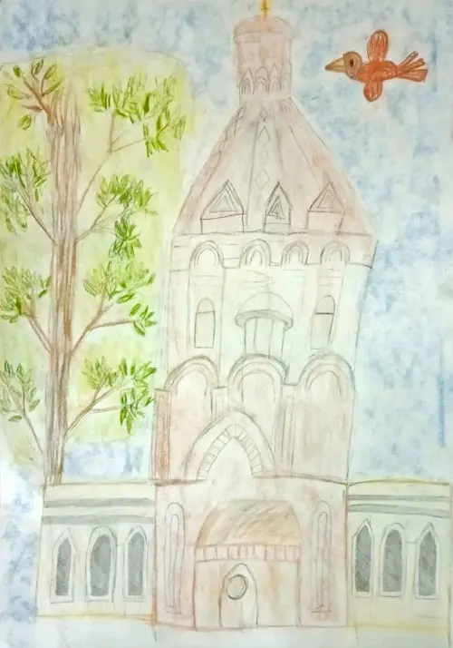 В нашем районе есть очень красивый православный храм. Я часто прохожу мимо его, мне очень нравится его архитектура. Я решила нарисовать его высокий и величественный вид.