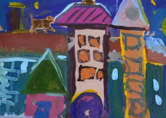 Я еще маленькая, поэтому моя мама мне помогла нарисовать картину, мы нарисовали вид района, из нашего вечернего окна видны другие дома и их дворы с детскими площадками, на которых мы с мамой играем.