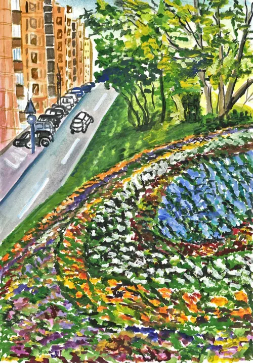 Одна из самых красивых улиц района, где я живу. На моём рисунке изображён знаменитый на всю Москву дом, в народе этот дом носит название «Китайская стена». Был построен по индивидуальному проекту.