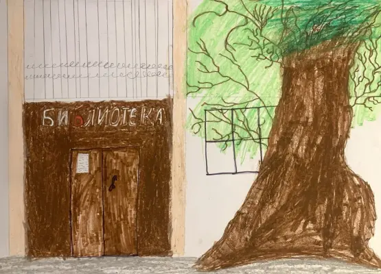 В уютном московском дворике притаился старинный дуб. Что он видел и слышал за многие десятилетия? Шумит его листва и тихо ведёт разговор. Рядом располагается детская библиотека, куда я хожу с родителями. В уютной домашней обстановке можно взять книгу, смастерить поделку и даже послушать концерт. Библиотека у старинного дуба – моё любимое место в районе, поэтому на рисунке я изобразила их рядом, ведь за многие годы они подружились и всегда рады рассказать что-то новое.