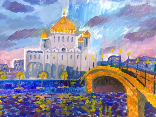 Вид с набережной на Храм Христа Спасителя. Можно смело назвать этот мотив одним из популярнейших мест в городе Москве для посещения, прогулок, фотосессий и объекта визуального искусства! Живописная работа форма тА2, техника гуашь.