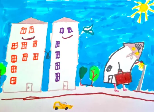 Напротив нашего дома есть детская площадка, поскольку здесь проживают многие семьи с маленькими детьми. Родители выходят с ними погулять или дети играют там со своими друзьями. Там есть песочница, различные качели, маленький детский домик на дереве и многое другое. Детям никогда не бывает скучно, а наоборот они очень хорошо проводят свое свободное время. Неподалёку от входа жители построили себе столик и четыре лавочки вокруг. Там они собираются с друзьями, которые также живут неподалёку, общаются, играют в шахматы и тому подобное.