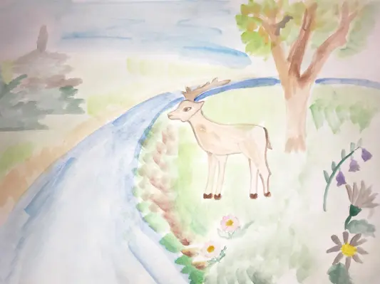 На рисунке изображен лес и речка, и лось вышел на берег, таких мы встречаем в лесу иногда, когда с мамой идём гулять. Вообще у нас очень красивый лес, мы любим наш «Лосиный остров»
