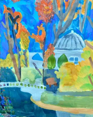 Живописный этюд с натуры в парке усадьбе «Кусково». Мы видим локальный приём техники живописи. Контрастирующие сочетания выгодно подчеркивают цветовое решение этюда. Формат работы А2, техника «гуашь»