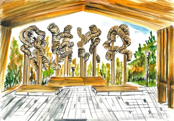 На рисунке видно, что юный художник старался передать атмосферу места: деревянные конструкции, закрученные декоративные элементы, свет и простор. Картина наполнена тёплыми оттенками: много жёлтого, зелёного и коричневого, что создаёт ощущение солнечного дня и уюта.