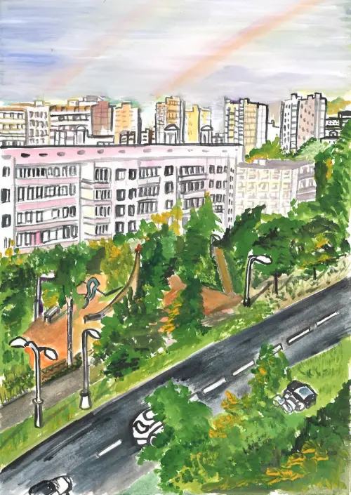 Летний день в моём любимом районе Отрадное. Прекрасный, летний, солнечный день. На улице светит яркое солнце, на небе проявилась яркая радуга. Щебечут птицы на деревьях.
