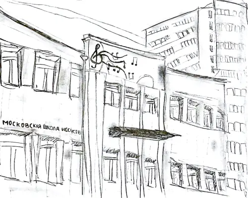 Я нарисовала нашу школу искусств имени Савы Мамонтова. Здесь я занимаюсь балетом и каждый день слышу, как из разных классов доносятся звуки музыки. Иногда, когда идёшь туда после уроков, кажется, будто попадаешь в другой, красивый мир.