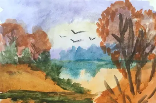 Рисунок передает уютную атмосферу золотой осени. На нём изображён живописный лес с деревьями в жёлто-оранжевых тонах, возможно, с тропинкой или речкой Гнилушой. Работа передаёт спокойствие и красоту природы в один из самых ярких сезонов года.