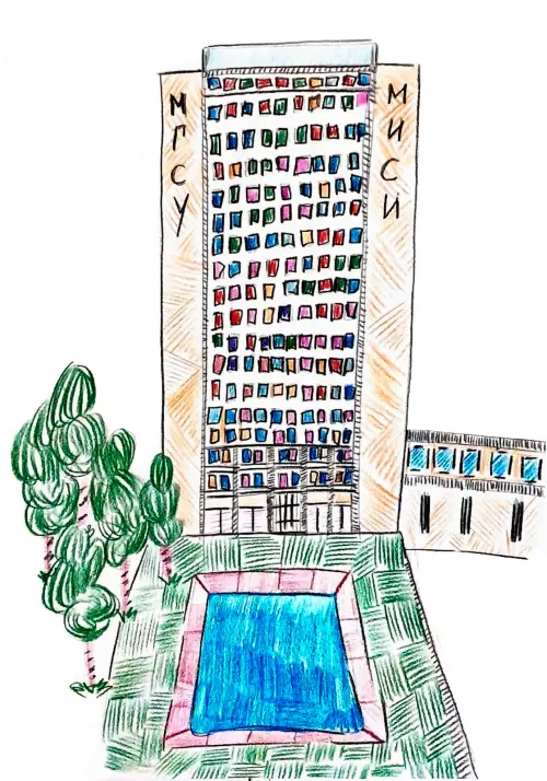 Я нарисовал здание МГСУ — это институт рядом с моим домом. Это здание очень высокое и у него много окон. Перед зданием есть бассейн и парк, где растут деревья, я люблю там гулять.