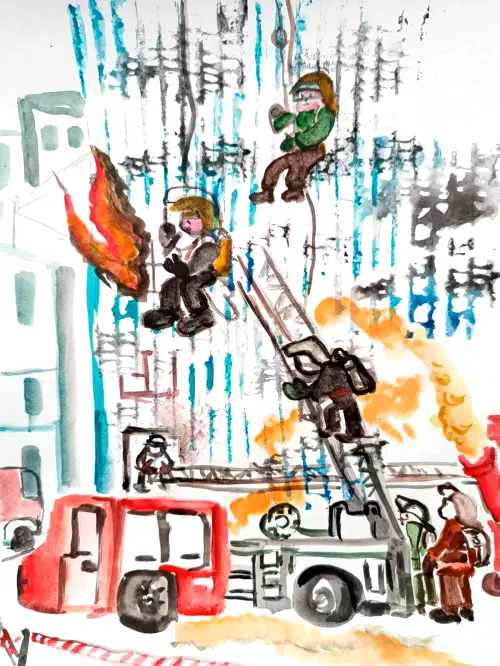 Я однажды видел, как горел в нашем районе дом и как пожарные его тушили, поэтому нарисовал свой рисунок! Когда вырасту, наверное, стану пожарным, они такие смелые и сильные!