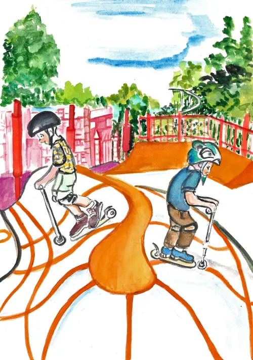 Яркая и динамичная скейт-площадка, нарисованная ребенком. Фигуристы (или скейтеры) катятся по рампе и выполняют трюки, вокруг — весёлые зрители. Площадка изображена с простыми формами, но наполнена движением и эмоциями. Яркие цвета, солнце в небе и улыбающиеся лица создают радостное настроение.