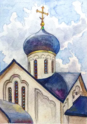 Работа выполнена в технике «графика», материалы: акварель, акриловый маркер, цветной карандаш. Работа была выполнена в апреле 2024 года. Ребенок изобразил храм города, в котором живёт.