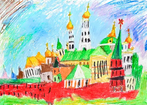 Работа выполнена в технике графика, материалы: масляная пастель. Автор был очарован величественными храмами города Москвы и под впечатлением была сделана работа на эту тему.