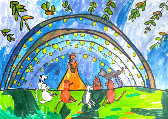 Девушка в нарядном платье прогуливается по парку «Сокольники» со своими питомцами. Этот парк мы можем узнать по аркам с фонариками. Работа выполнена маркерами для скетчинга на листе формата А3.
