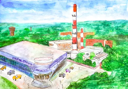 Работа выполнена в технике графика, материал: акварель, линер. Автор изобразил любимый город Троицк с высоты птичьего полета. Город спорта, который утопает в зелени.
