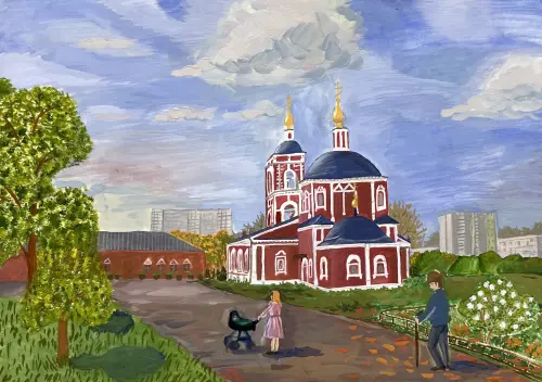 Храм Покрова Пресвятой Богородицы на Городне — православный храм в районе Чертаново Южное города Москвы. Относится к Донскому благочинию Московской епархии Русской православной церкви. Другое название храма — церковь Покрова Богородицы в селе Покровском.Является единственным сохранившимся памятником истории и архитектуры этого района. Главный престол — в честь Покрова Пресвятой Богородицы; приделы — святителя Николая Чудотворца, праведных Захарии и Елизаветы. При храме действует Московская школа церковных звонарей «Колокольный Градъ» для взрослых и детей.В годы советской власти в здании храма размещалась фабрика «Металлист». Осенью 1990 года началось восстановление храма на средства верующих жителей района. В 1991 году к празднику Пасхи был освящён первый придел храма и началось богослужение. Местные жители и прихожане очень любят прогуливаться рядом с этим храмом. Работа выполнена в технике гуашь.Храм Покрова Пресвятой Богородицы на Городне — православный храм в районе Чертаново Южное города Москвы. Относится к Донскому благочинию Московской епархии Русской православной церкви. Другое название храма — церковь Покрова Богородицы в селе Покровском.Является единственным сохранившимся памятником истории и архитектуры этого района. Главный престол — в честь Покрова Пресвятой Богородицы; приделы — святителя Николая Чудотворца, праведных Захарии и Елизаветы. При храме действует Московская школа церковных звонарей «Колокольный Градъ» для взрослых и детей.В годы советской власти в здании храма размещалась фабрика «Металлист». Осенью 1990 года началось восстановление храма на средства верующих жителей района. В 1991 году к празднику Пасхи был освящён первый придел храма и началось богослужение. Местные жители и прихожане очень любят прогуливаться рядом с этим храмом. Работа выполнена в технике гуашь.