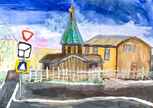 На прогулке увидели на пересечении нескольких дорог храм-часовню святителя Макария Митрополита Московского и Всея Руси, которая изображена на рисунке.