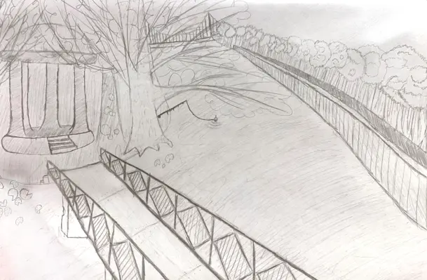 На рисунке изображён наш любимый маршрут для прогулок. В парке «Заречье» можно прогуляться вдоль реки по мостам, соединяющим острова, посидеть в беседках-ротондах, полюбоваться тихой гладью реки, покормить уточек. Здесь можно встретить белок и разных интересных птиц. По реке мы любим кататься на лодке или катамаране. А ещё можно взять удочки и снасти и отправиться на рыбалку! Очень здорово, что такое место есть прямо рядом с домом!