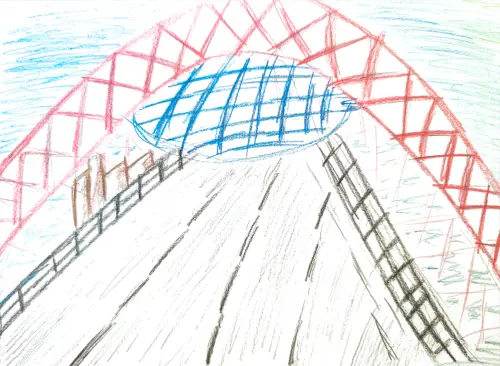 Я нарисовала этот мост, потому что считаю его уникальным архитектурным объектом Москвы. Он меня очень впечатлил, у него очень необычная арка, которая свисает над руслом реки.