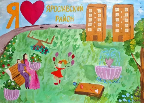 На моём рисунке — самый лучший район! Здесь много-много зелени, и всегда светит солнце. У нас во дворе такая классная площадка для игр, что мы с друзьями можем играть там целый день!