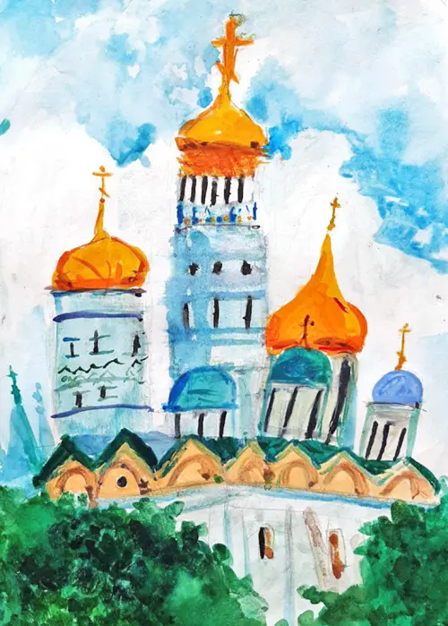 Работа выполнена в технике акварельная графика, материал: акварель. Автор изобразил красоту и величие золотых куполов Москвы после прогулки по территории Кремля.