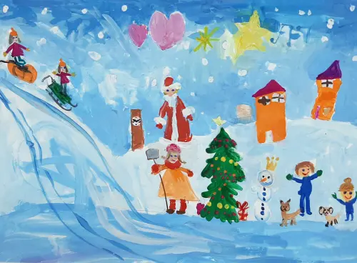 Работа выполнена в технике «графика», материал - гуашь. Автор постарался передать атмосферу новогодних праздников и донести до нас ощущение праздничного настроения, которое царит вокруг её дома во время самых любимых праздничных дней в году.