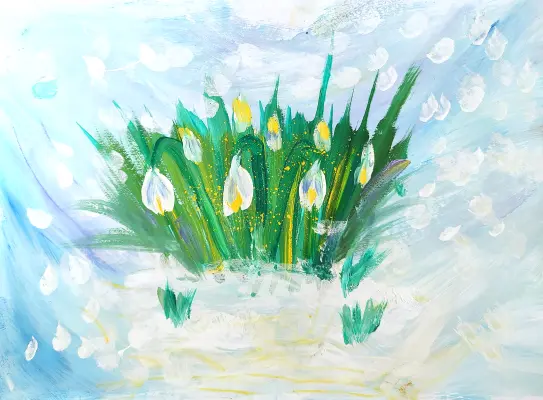 На рисунке – полянка с подснежниками в моём дворе. Нежные, белые цветы с тонкими зелёными стебельками пробиваются сквозь прошлогоднюю листву. Земля ещё влажная и тёмная, видны проталины. Вокруг подснежников – зеленая трава, только-только начавшая расти. На заднем плане – стволы деревьев, покрытые корой. Солнечные лучи пробиваются сквозь ветви, освещая полянку и подснежники. Рисунок передаёт ощущение весны, свежести и пробуждения природы. Подснежники символизируют надежду и новую жизнь после зимы. Чувствуется тишина и спокойствие, нарушаемые лишь пением птиц.