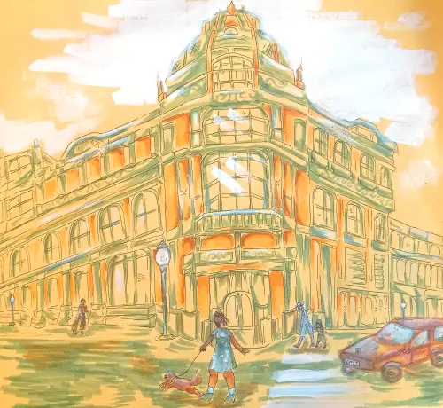 Я изобразила дом на Арбате в Москве. Постаралась передать свои впечатления, выбрав бумагу и материалы. Ощущение лета и красоты архитектуры в моём городе. Я занимаюсь в студии «Аллегро».