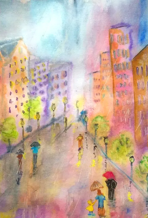 Мне нравится, когда идёт дождь. Я люблю наблюдать из окна, как стекают капли по стеклу. Как свет растекается от фар по мокрому асфальту. Город становится призрачным. Едва заметны очертания машин, домов. Вот поэтому я нарисовал мой город в дождливую погоду.