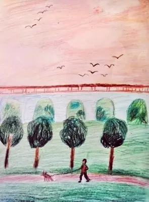 В ярких красках изображён живописный район с высоким акведуком. На переднем плане гуляет человек с собакой, а в небе парят свободные птицы. Картина наполнена светлыми, насыщенными цветами и добрым настроением, передающим тепло и гармонию этого уголка города