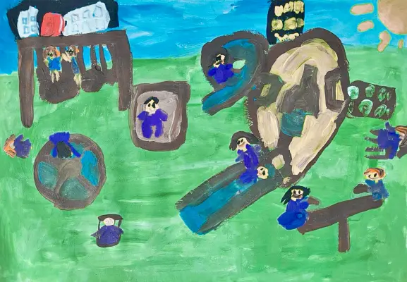 Я люблю гулять на детской площадке. У нас есть горка, качели, карусель, песочница и качалка. Я люблю качаться на качелях и делать из песка куличи, в этом мне помогает папа.